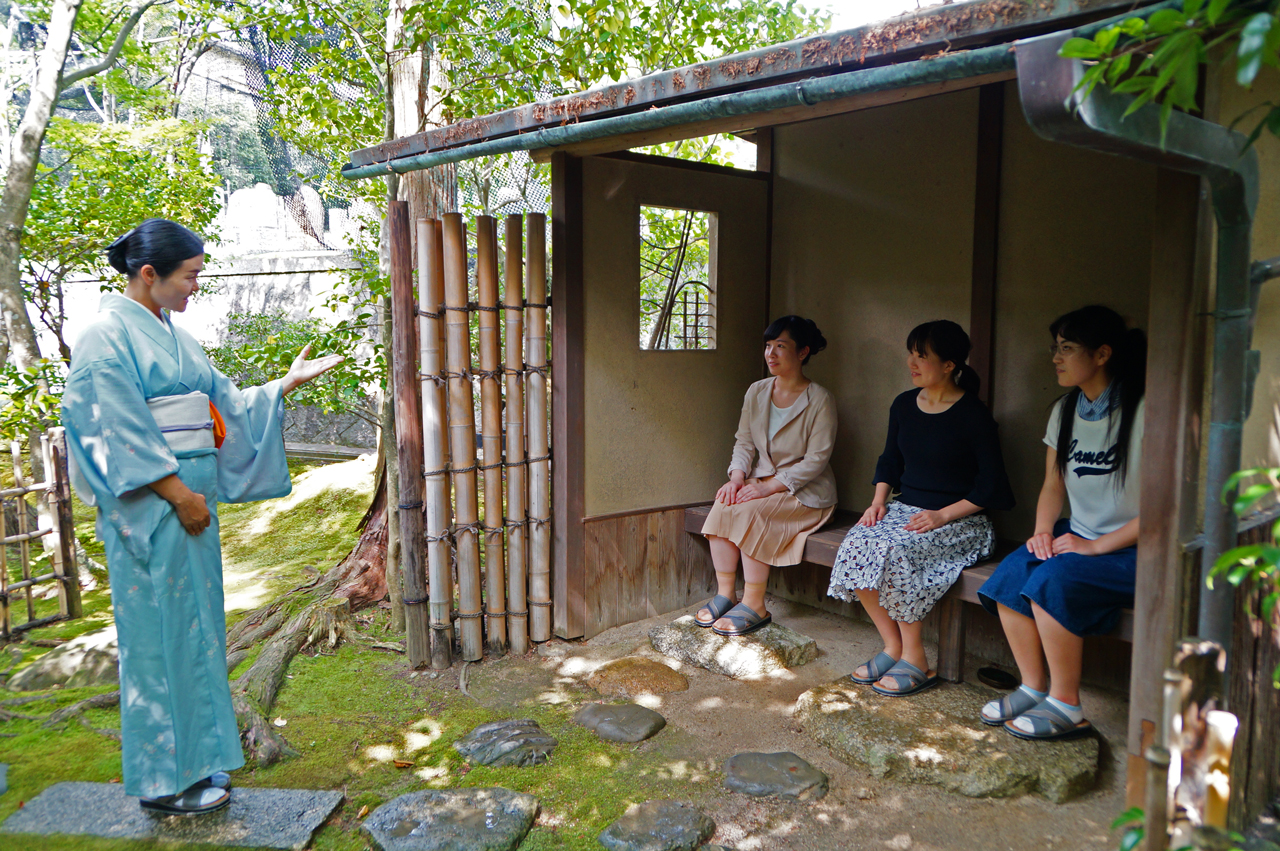 飛び石の上を歩き、苔は踏まないでください。写真はご自由にどうぞ。今、通ってきていただいたのは、露地と言って、お茶室に付随した庭です。きれいなお花はさいていませんが、自然に近い形をしています。お客様は露地に一歩足を踏み入れたときから、心を静め、厳かな気分になります。今、歩いてきていただいた飛び石をつたっていくと、お茶室に到着します。